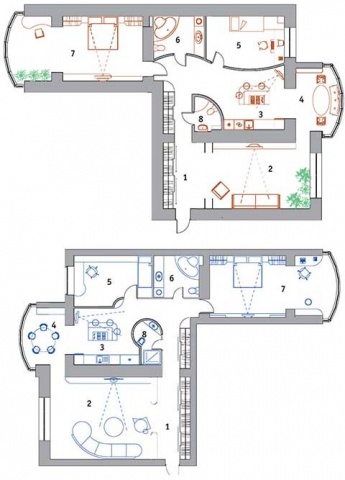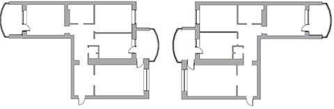 Идентичность планировок двух квартир изначально подразумевает схожесть, но только по форме. Значимость индивидуальности каждой была подчеркнута характером линий межкомнатных перегородок. Внешнее преобразование посредством разумного совмещения пространства и непринужденного разделения индивидуальных зон придало образу квартир свежести, раскрепощенности и целостности.
