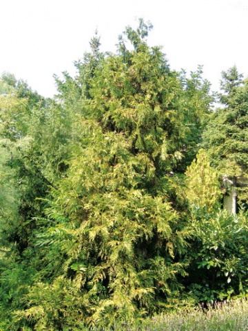 Медленнорастущее дерево. Высота – до 30 м. Крона яйцевидная. Хвоя чешуевидная, блестящая, темно- зеленая с желтыми полосами. Предпочитает полутень или тень, требователен к влажности воздуха и плодородию почвы.
