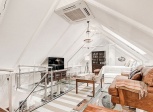 На первом уровне квартиры находятся кухня, столовая, гостиная, спальня, офис.